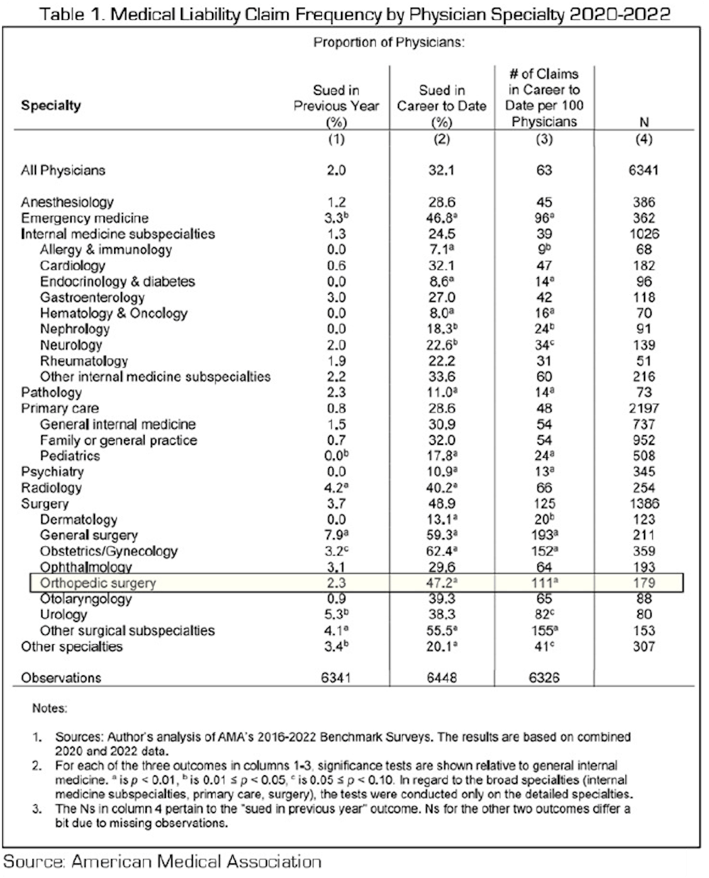 Compared to other specialties, orthopedic surgeons are sued a lot, but not the most. Table 1, from the American Medical Association, presents claim frequency by specialty over the previous year, career to date, and number of claims career to date per 100 physicians. During their careers, 47.2 percent of orthopedists have been sued at least once. This is the 4th highest rate of all specialties, behind OB/GYN (62.4 percent), general surgery (59.3 percent), and other surgical subspecialties (mostly neurosurgery; 55.5 percent). The same is true in terms of number of claims over a career per 100 physicians; orthopedic surgery is 4th at 111 claims (or 1.11 claims per physician), behind the same 3 other specialties.